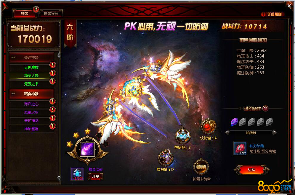 首先是第一种挂机情况下,海洋之心是首选,回血回蓝保证挂机时最基本的生命和魔法值。然后个人觉得凤凰火羽和灭世魔杖的性价比要高点,对小怪的伤害也是非常可观的。那么PK时需要带哪三种神器呢?玩家在PK时很大一部分伤害是来自于神器,其次就是技能伤害,但是附加元素伤害的技能那么元素之书这把神器又是必不可少的,另外凤凰火羽也能对玩家造成相当高的伤害,所以我觉得凤凰火羽也是比不可少的,最后一个神器的选择便是防御类的神佑神盾,此神器的获取方式非常苛刻,需要玩家充值累计获得的碎片才能获取,当然对伤害的减免也是相当可观的,所以PK时带上这3个神器可以助你在战场上占据很大的优势。