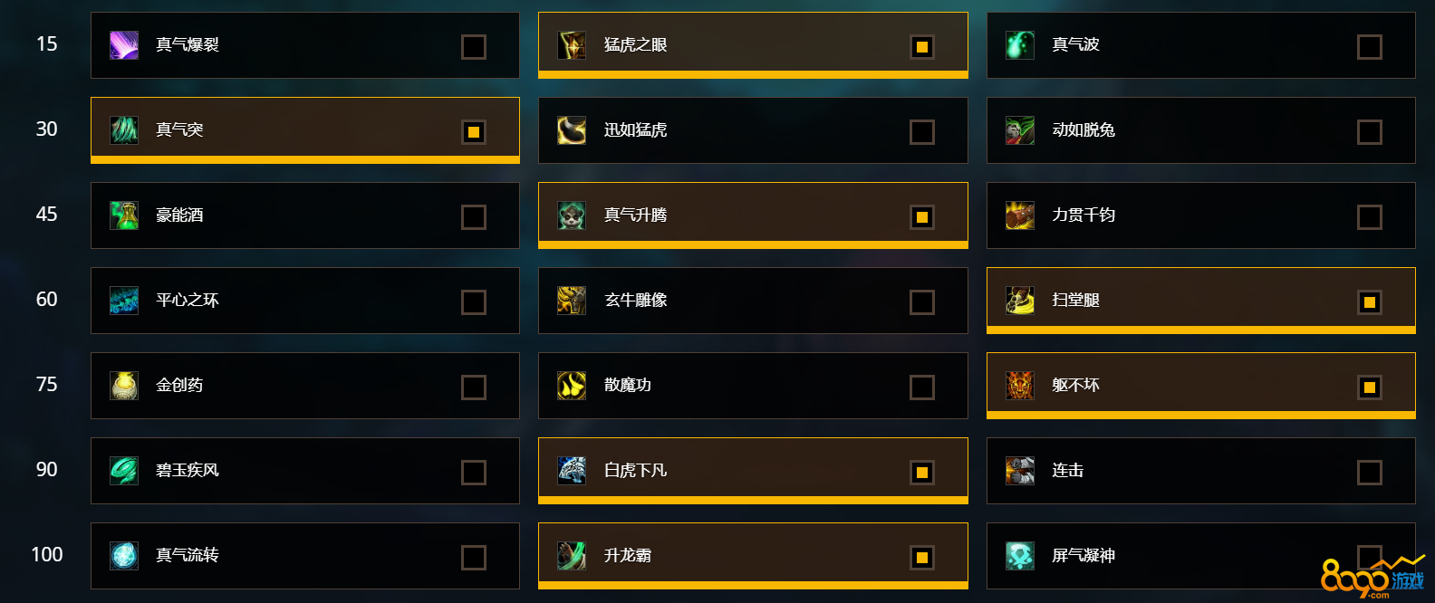 第一层:猛虎之眼:猛虎掌同时为目标施加猛虎之眼,在8秒内对其造成77,584点自然伤害,并为武僧恢复67,172点生命。被动技能,保证自身血量。