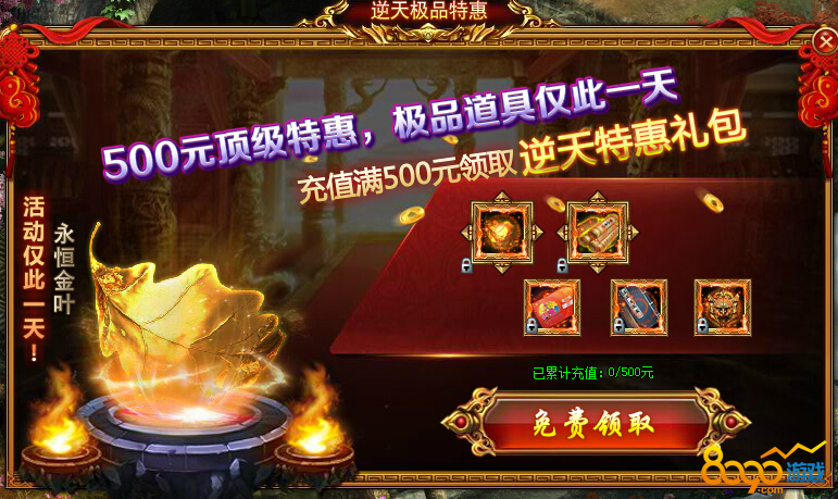 活动期间只需累计充值满500元即可获得永恒金叶道具,激活后,可以永久提升武将三百万战力,并且永久激活珍宝阁金叶子道具“无尽生命之源”兑换功能,玩家每天可以在金叶子商城界面领取金叶子20个,还可以花费少量绑元进行双倍领取,额外获得一次金叶子,双倍领取时更有概率获得永恒祝福,额外获得无尽生命之源、万世护甲之源、五百万战力、8888绑元、金叶子100个等其中一个极品奖励!