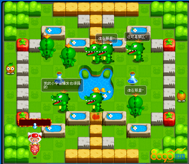 搜索"8090网页游戏"海皇06第一关是有窍门的。如右图(3所示),先干掉左右两侧的2个小怪物,一般来说放一个泡泡封死在角落就可以了。重点是中间一大片区域内的鳄鱼中级怪物,这种中级怪物需要炸2次才会死,而且第一次炸到之后需要在4秒钟之内炸第二次,才会死,否则被炸一次之后的怪物会恢复原样。这片区域内怪很多,进去杀很危险,而且需要一个怪杀2次,走位又受到限制,难度很大。