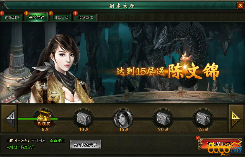 在副本通关中,玩家可挑战寻找文锦副本,当顺利通过15层时方可寻得陈文锦激活卡。在寻找文锦的路上不仅可获得颇丰的战斗经验,每五层的挑战均可获得银币以及伙伴进阶丹提升战斗能力。