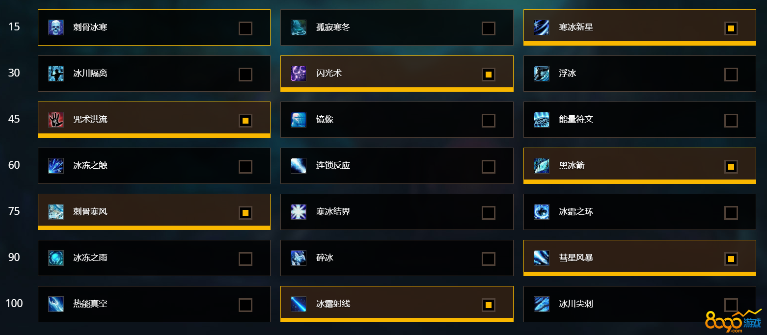 搜索"8090网页游戏"现在是8.0版本前夕,法师技能也做了调整,法师作为暴雪的亲儿子,三系法师在前夕都很厉害,冰法能做出很强势的控杀。下面介绍下冰法PVP的专精和天赋选择。