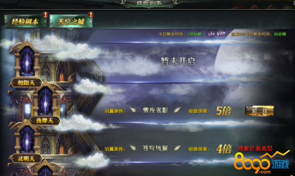 当玩家到达所需要的等级时,天空之城便可自动开启。而天空之城的层数则需要羽翼等级相应提高,因此单是提升人物等级是没用的。天空之城对玩家最大的诱惑可以说是丰厚的经验奖励了,玩家参加完副本便可获得3倍的奖励,想要获得更高倍的经验奖励则需要玩家参加苍穹堡垒的试验。