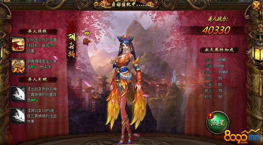胡喜媚,美人技能,莺鸣翠柳:幻化出小鸟攻击直线目标,造成7%伤害。凤凰涅槃:胡喜媚提高主人暴击6%,持续7秒。美人天赋。闻鸡起舞:受到封神三宵娘娘的伤害降低60.激活条件,结束达到6阶。鸡犬升天:100%免疫三宵娘娘的流血效果。激活条件。胡喜媚的结束达到9阶。
