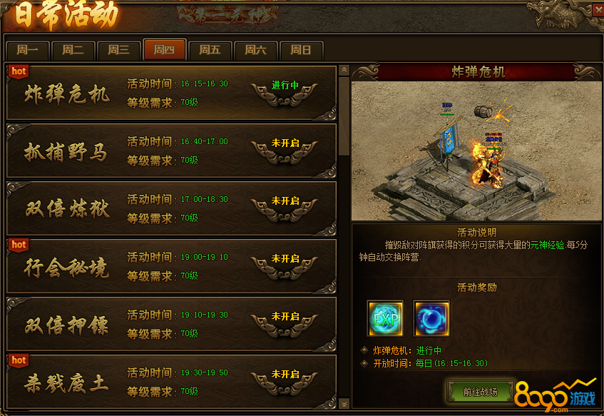 搜索"8090网页游戏"传奇世界游戏中的炸弹危机活动都有什么样的规则,该如何去玩呢,参与炸弹危机活动玩家都可以获得什么样的道具奖励呢,今天小编我就来给大家介绍介绍吧~