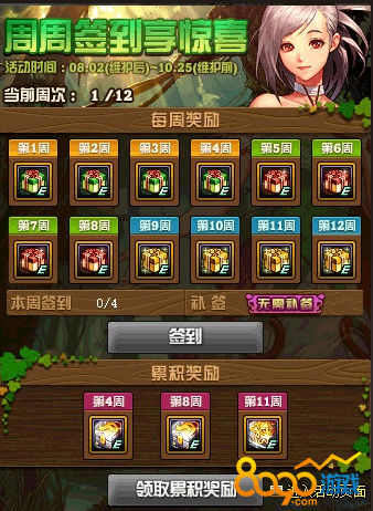 本次签到,对于悲叹之塔以及深渊票奖励之类的就不多说了,基本都是蚊子腿。主要还是累计的奖励。活动期间,累计签到4、8、11次可以获得累计签到礼盒,活动期间可以额外通关40次推荐地下城补签2次。