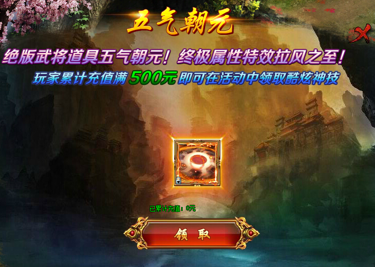 玩家只需在活动期间充值满五百元即可获得该道具,激活后可以直接提升上阵武将总计百分之二十的伤害减免,武将感悟天地五气,攻击时有概率对地方随机武将造成50%生命上限的伤害,并且可将助阵武将生命值总计5%加成于上阵武将之上,打造巅峰不死武将!生命加成可被虎符等各类系统加成,至高战力即刻拥有!