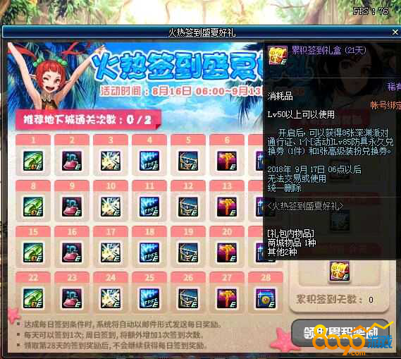 这活动和以前的每日签到形式一样,每天通关两次推荐地下城完成签到,奖励有经验胶囊、防虚弱药、契约、魔界裂缝门票、大眼仔、复活币这些奖励,累计奖励会送一个夏日宠物,还有对应的宠物宝珠,除此之外,还有一张高级装备兑换劵和一张200天史诗永久兑换劵,这是第三张永久史诗兑换劵了,看来永久史诗套离我们是越来越近了。
