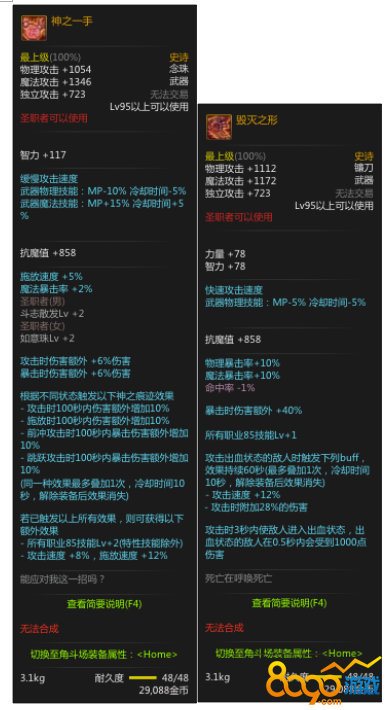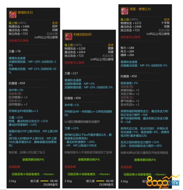 以上五把是95新普通史诗武器,95所有深渊地下城出品,属性强力,无法升级。