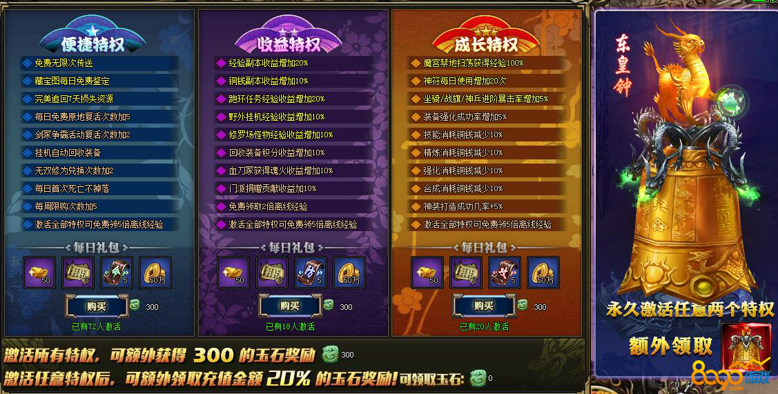 游戏中的三种特权名称直接涵盖了三种不同的增益属性,另外每种特权每天还能领取一次每日礼包。每种特权的属性非常的多而且十分的详细,三种特权每种的价格为300玉石,激活三种还能额外获得300的玉石返利。激活任意两种可以领取一个东皇钟的神器。各种奖励和优惠等你来领取!