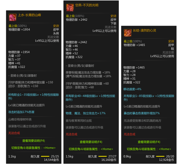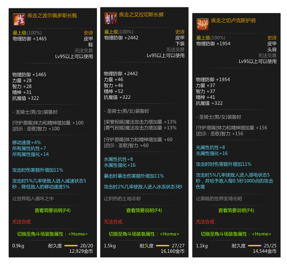 以上就是本次95ss防具的皮甲部分,95之后韩服开放了跨甲系统,可以将不同种类的防具在不改变特殊属性的情况下转化成类型的防具,比如皮甲可以保留所有的额外属性变成重甲或者其他的,便于玩家选择合适自己的装备发挥精通的效力。但是圣骑士跨甲的平衡很难做,于是就像图中的一样所有装备都自带圣骑士的加成无法跨甲了。