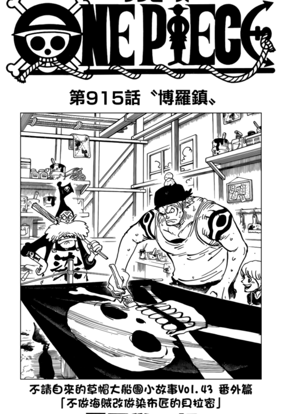 首先来看漫画封面,结合上一话的封面来看,来到染坊镇并非红发,而是贝拉米,这个镇子应该是专门制作海贼旗的镇子,所以才会飘着这么多的海贼旗。小编猜想封面中贝拉米在制作的海贼旗应该是给自己的,在德雷斯罗萨篇时贝拉米的信仰破灭了,路飞给了他新的信仰,所以他应该是准备成立一个自己的海贼团重新出海,才会有封面上的景象,海贼旗是一个海贼团的灵魂,亲手制作的才会显得更加有意义。