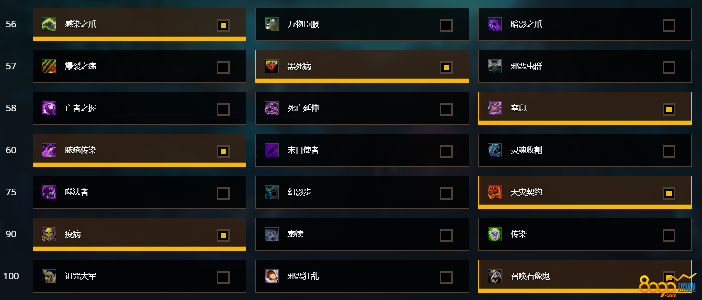 死亡骑士总共有3个专精,分别是献血、冰霜和邪恶,那么今天来介绍一下邪DK在战场中的天赋选择。