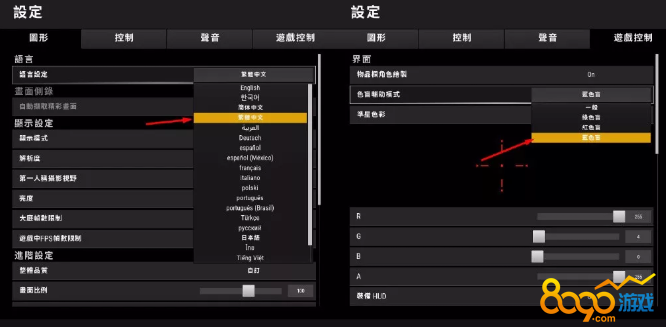 其实不光是紫血,在绝地求生中血液的颜色可以调成绿、红、粉、紫这几种颜色。首先需要把文字更换掉,因为简体中文血液本身就会被和谐成绿色,打人飚绿血就仿佛打的是绿巨人一样,这里推荐大家更换成繁体中文,然后在游戏控制的色盲模式中选择蓝色盲,之后就是显示的紫血了,显示粉血的话只用调成红绿色盲模式就可以了。