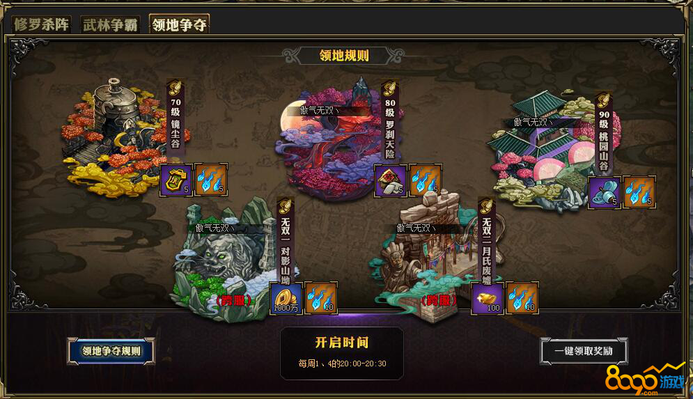 搜索"8090网页游戏"寒刀行游戏中,领地争夺是江湖争雄副本中的一个活动,玩家每周一和周四的8点开始,活动持续半个小时,玩家通过门派的合作占领各个地图的拥有权,从而获得丰厚的奖励,那么该如何争夺领地呢?