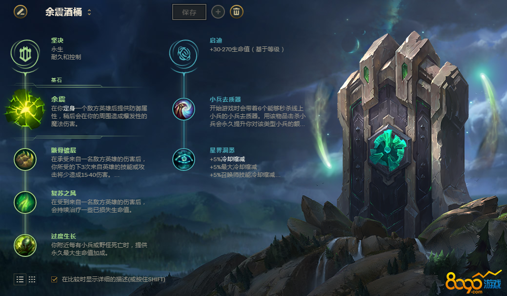 和打野酒桶不一样的是,打野酒桶通常选择电刑或者是艾黎而辅助酒桶只有唯一个个选择就是余震。因为酒桶辅助是带蓝工资装,不带余震的话所以非常的脆,所以不管是对线还是打团,对于要开团的酒桶都是极为不利的。而且酒桶的E技能触发余震的被动伤害,对于前期伤害已经很高的酒桶来说在对线的前期可以打出很高的伤害。