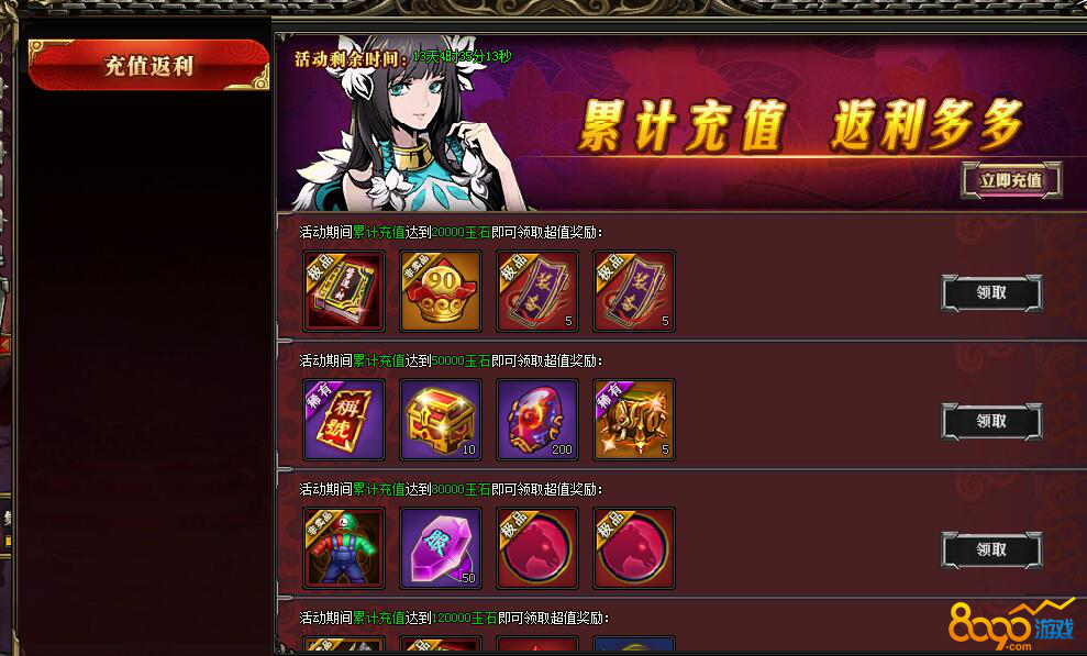 搜索"8090网页游戏"寒刀行游戏中,充值返利的活动是新区开服的活动,活动持续14天,累计充值不同档可以获得相对应的奖励,充值越高,奖励也是越丰厚的,累计充值奖励分为12档,从最低的登录奖励到累计充值20万玉石不等,适合不同充值能力的玩家。