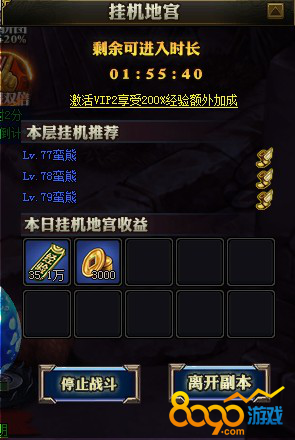 玩家每天都会有两个小时的挂机地宫时间,地宫是全天开放的,玩家可以随时进入,当然如果是在活动地图或者副本地图的话那么就无法进入了,激活VIP2的玩家可以享受到200%的经验额外加成。
