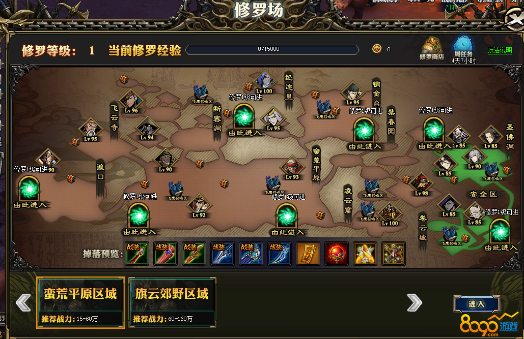 搜索"8090网页游戏"寒刀行游戏中修罗战场的开放时间是在开服后第三天开启,玩家人物等级达到无双3级可进入,修罗场可以进行事件任务、修罗周环、击杀BOSS等活动来获取奖励装备和道具。修罗场获取的道具会进入临时背包,需要召唤猎鹰运送物品离开修罗场,运送出去的物品会存入背包中的随身仓库,可到随身仓库提取使用。