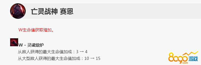 在8.16版本中,赛恩的W技能被动的增强是关键的一点,从小兵身上获得的生命值加成增加了4点,从大型打野,史诗野怪,英雄身上获得的生命值加成上升了15点,足足提升看50%,在这样的改动下,赛恩的整体坦度要比之前高将近百分之30%,而W技能可以无限增长,补兵就可以,光是带兵线,一波兵全吃就可以给赛恩增加24点血量,有跑车则可以增加39点。