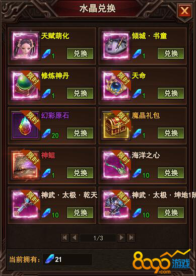 搜索"8090网页游戏"太极崛起游戏里,有的道具和装备必须要水晶来兑换,那么水晶怎么获得呢?水晶换哪些道具和装备才最划算呢?下面小编就来告诉大家。