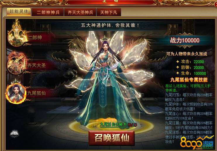 第三个是九尾狐仙,激活后可以直接获得五大神技,无需激活额外的神兵!九尾扫荡:每次攻击时有概率触发九连击;九尾护体:每次受到攻击时有概率免疫该伤害;九尾连心:每次攻击有概率扣除敌方10%生命;九尾狂暴:每次攻击有概率在一定时间内增加20%战力;九尾迷惑:每次攻击有概率使敌方无秒内无法攻击!