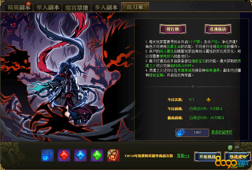 每天玩家都可以挑战一次该副本,如果玩家充值达到VIP10的话,就可以免费购买额外的挑战次数啦,另外当玩家达到VIP8的时候,就可以免费快速通关,其他玩家则需要话费少量的玉石来获得快速通关的权利,快速通关可以让我们直接到达第15关,可以让玩家节省大量的时间,因为血刀冢副本每一关所耗费的时间还是挺长的。