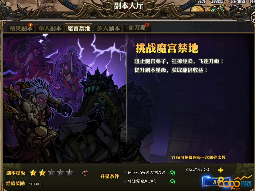 搜索"8090网页游戏"寒刀行游戏中快速升级才能转生到无双,才能带上更厉害的装备,所以等级是寒刀行不可缺少的,那么问题来了,获得大量经验的方法有哪些呢。副本大厅经验副本,玩家每天可挑战2次每次都可获得大量经验,通过规定的2星副本次数可升级3星,每天可直接扫荡。其他副本每天也额可获得少量经验。魔宫禁地经验每次也可获得几千万,还可通过元宝1.5倍领取每个玩家每天有2次挑战机会,vip6可免费购买一次额外的次数。
