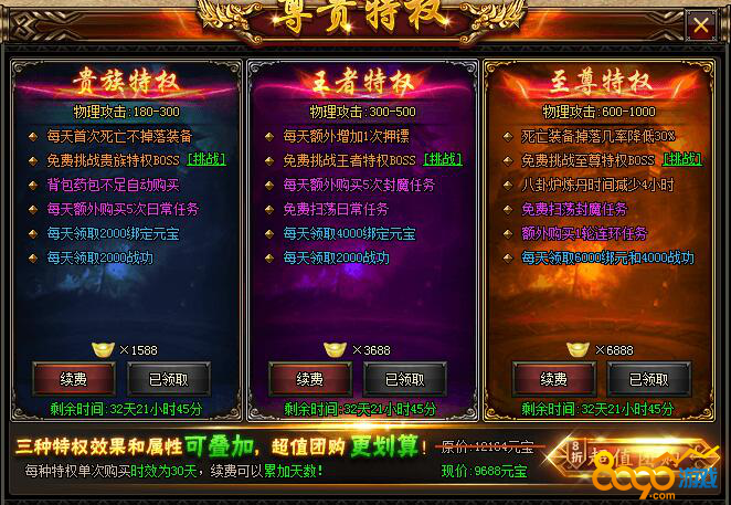 在8090天威传说中,所有玩家都可以购买三种特权,分别是贵族特权,王者特权以及至尊特权,购买每种特权的有效时间都是30天,然而如果想要一起购买三种特权可以点击超值团购,享受折扣的情况下就能一起购买三种特权。