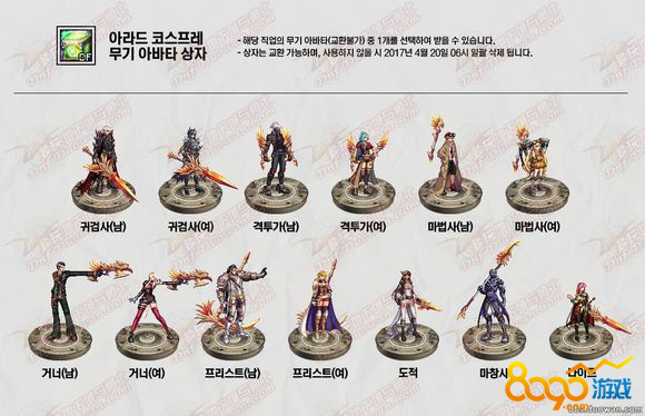 有消息称,今年夏日套的武器装扮有部分被阉割,下图这套以前的韩服套装大家可以看到这套有格斗男,魔术师男法瑞女等13个职业。