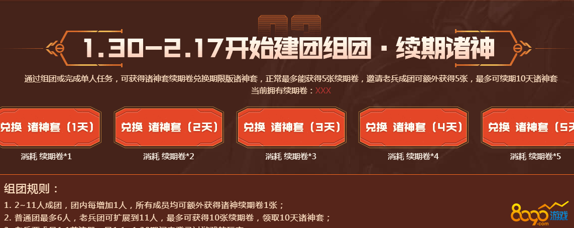 在1月30日的时候,玩家们是可以免费的领取诸神套的。在1月30日到2月17日活动期间,玩家们可以组团建团,然后去获取诸神续期券的。玩家们可以分享给自己的好友,进行组团或者完成单人的任务,玩家们还可以邀请老兵进行成团的。玩家们可以选择1到11个人进行成团的,主要是有1天、2天、3天、4天和5天。这个诸神套不是永久的,毕竟这个还是蛮贵的,不过可以入手免费使用几天还是非常的划算的。