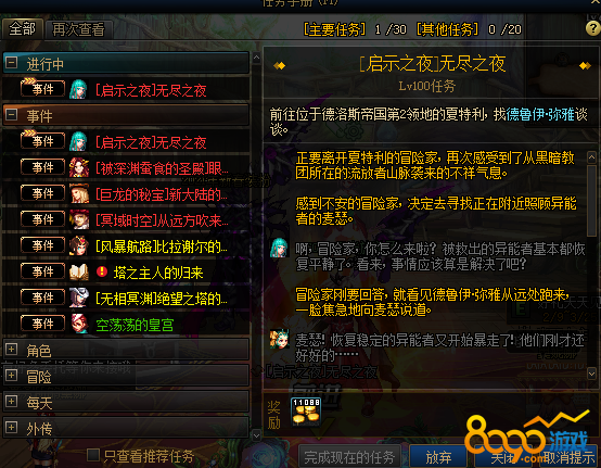 玩家们直接在更新完之后在任务手册那边去找到这个正在进行重点无尽之夜的任务,这个任务是直接去找德鲁伊米雅然后交谈就可以了,还是非常的简单的,玩家们只要按照上面的要求然后去做就看可以了,其他的是没有什么限制的哦,还有一点需要注意的是玩家们的等级必须要达到100级才可以哦,否则是无法开启这个任务的哦。