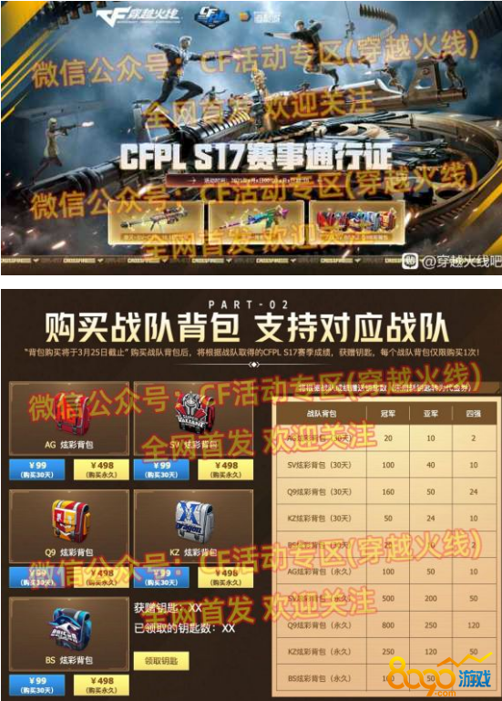首先我们先来看看这个活动的内容吧:玩家们需要购买战队背包来支持不同的战队,活动截止到3月25日,这个将genuine到战队取得的成绩然后获得到不同的奖励的哦。99元可以购买到30天的AG炫彩皮肤,498元可以购买到永久的SV炫彩皮肤,498元可以购买Q9炫彩皮肤,99元可以购买30谈的KZ炫彩皮肤,498元会获得永久的BS炫彩背包。最后的时候会根据战队的成绩来发放不同的钥匙个数的哦,还没参加这个活动的玩家们快点去参加这个活动吧,祝大家好运哦。