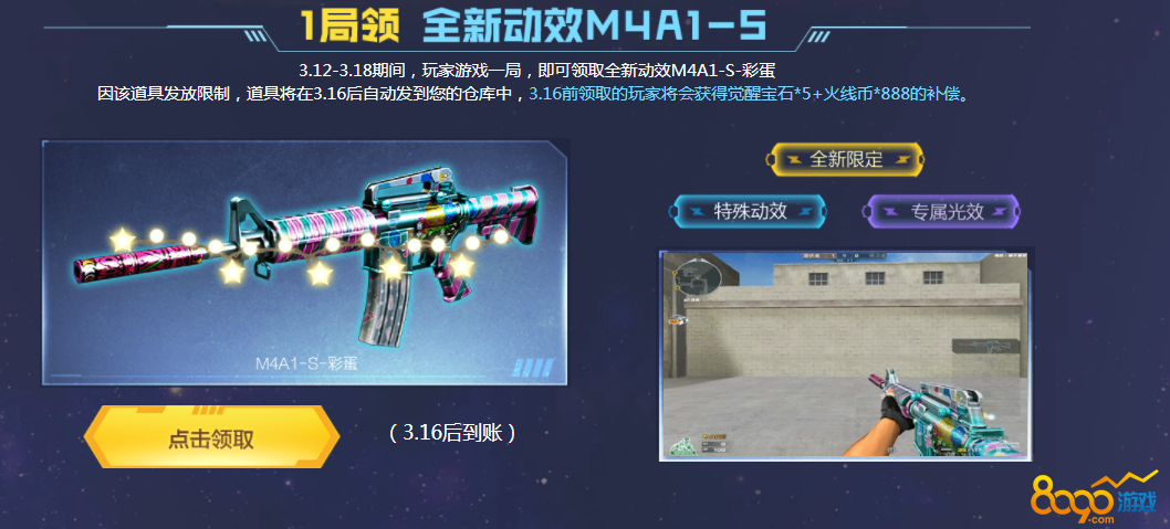 Cf专属动效武器是吗M4A1-S-彩蛋,这把武器属于全新限定的拥有特殊动效以及专属光效,即将在3.12开放活动,在3.12到3.18日期间进行一局游戏即可获取,不过因为发放限制,道具要到3.16号才能够自动发放到小伙伴们的仓库中。下面的话还有一个砸彩蛋的活动,累计游戏的天数越多的话能砸出的奖励也就越好,累计3天必得稀有的武器一个,有可能是有时限的也会是永久的,累计4天的话就是必定获得一个永久的了。