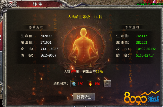 我们转生界面就可以看到随着转生等级的提升,所带来的属性加成是非常巨大的,不论是生命值还是攻击力提升都是非常明显。那么小伙伴们可能会问了,怎么转生呢?