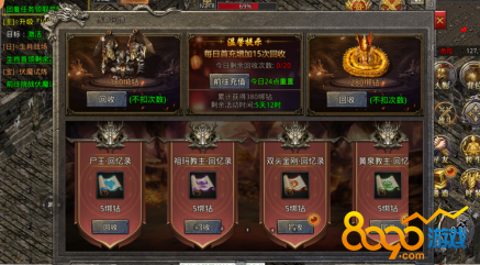 传奇回馈活动是最近新上的一个活动,玩家通过打败BOSS,有几率随机掉落8种回忆录,其中普通的回忆录有6种都是价值5绑钻。另外两种稀有的回忆录分别是价值180绑钻的魔龙教主和280绑钻的火龙王。其中普通回忆录每天有5次免费兑换次数,任意充值后可增加15次,也就是说每天20次的上限。而稀有回忆录则没有使用限制,打到就是赚到。