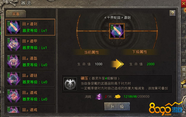 在火龙传奇游戏中,器灵可进行升级,基础属性是增加生命值,但是当玩家的器灵升到4级之后,即可解锁专属效果碾压,具体作用为,玩家装备的剑甲或饰品等级高于对手,有概率触发减伤,这个效果是可以叠加的。