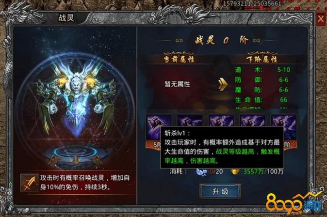 战灵作为一种召唤物,在攻击敌方时会有几率召唤出来,在关键时打出致命伤害,战灵不仅对道术有增加,还对防御,魔防,生命值等有提升,战灵等级越高所造成的伤害就越大。