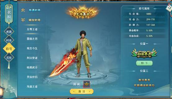 称号分为普通称号和稀有称号这2种,都是需要消耗对应的称号原型进行激活的。称号激活成功后,会给玩家提供生命值、攻击力、防御力、暴击概率、攻击加成等属性。游龙传说游戏中的称号有很多种,每种称号的属性都不一样。