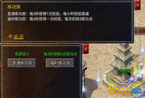 练功房共有2种,分别为普通练功房和福利练功房。普通练功房可免费进入,每3秒可获得一次经验,之后可获得的经验会慢慢衰减。福利练功房也是每3秒可获得一次经验,经验不会逐渐衰减,但是每3秒需要消耗3点练功点。