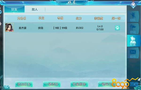 仙侠神域游戏中的好友系统,玩家可以添加好友,与好友聊天,邀请好友一起组队刷副本打boss。除此之外,还有一键踩空间功能,可以让玩家可以速获得活力,玩家点击好友头像,可以查看好友的资料或直接和好友聊天。