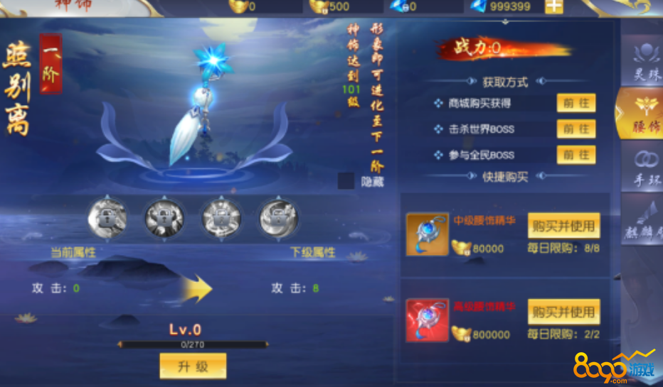 腰饰是神饰中的一种,玩家通过商城购买、击杀世界boss、参与全民boss等方式,可以获得腰饰。玩家进入神饰界面,即可查看自己已经获得并激活的腰饰以及属性。玩家想要对腰饰升级,需要消耗腰饰精华,中级腰饰精华和高级腰饰精华可以在商城中直接购买获得。