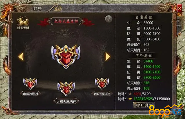 玩家需要找到封号管理员NPC "封号",点击"我要升级"按钮,消耗功勋令和绑定元宝,即可逐级提高你的封号等级。玩家提升封号后,可以获得生命、攻击/魔法/道术、防御、魔防的属性加成,而且还能获得一些天赋点,这些天赋点可在封号等级达到雄威战狂、雄威法魄、雄威道玄时,进行添加天赋点操作,获得相应的属性效果。