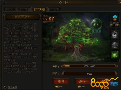 公会古树的出现的会在玩家开服60天后,我们可以每天在公会--公会古树页面点击祈福,浇水,施肥。提高我们公会古树是可以获得材料然后在公会商店里面购买道具的。但是公会故事的话是必须开启公会家园的。这个的话,我们可以在商场里面购买公会家园地契,然后双击道具即可开启公会家园。开启公会家园之后就可以正常给古树浇水施肥了。每天坚持给古树提升等级,可以提高古树祝福,从而赠礼战力!每周2晚上19-21点,有公会入侵,会有其他平台的玩家来攻击我们的古树,我们必须要保护好它!不然古树被打死后,需要我们持续浇水施肥,恢复健康值后才能享受古树给我们带来的福利!