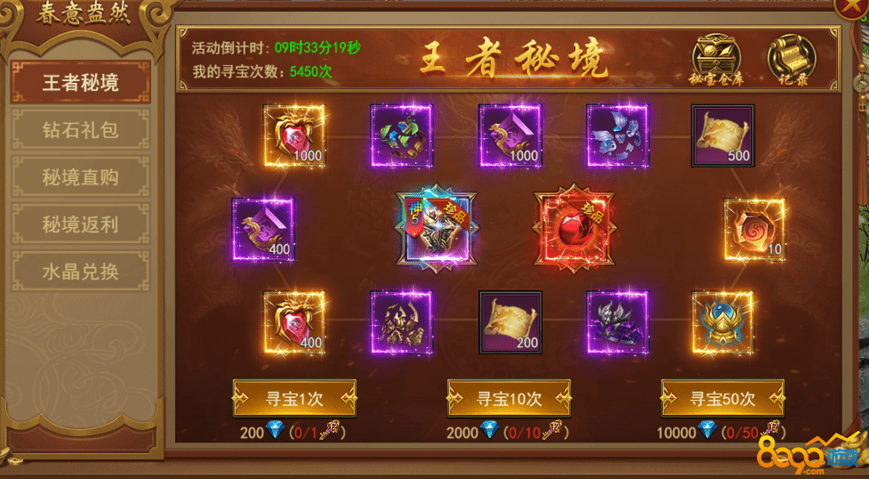 今天给大家介绍的是王者之心2秘境之语活动,秘境之语活动共两天,可以在游戏中通过直购或者钻石购买秘境钥匙进行寻宝,寻宝的珍品是屠龙神装披风,以及王者水晶,王者水晶可以在水晶兑换出兑换高端装备和材料。寻宝达到一定的次数可以有返利水晶,也可以直接进行兑换。
