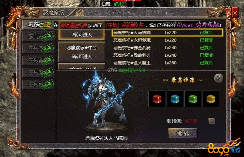 恶魔祭坛共有5层,玩家可以根据自身的转生等级,选择进入相应的层数,玩家的转生等级越高,可进入的层数就越多,12转后所有层数都能进入。