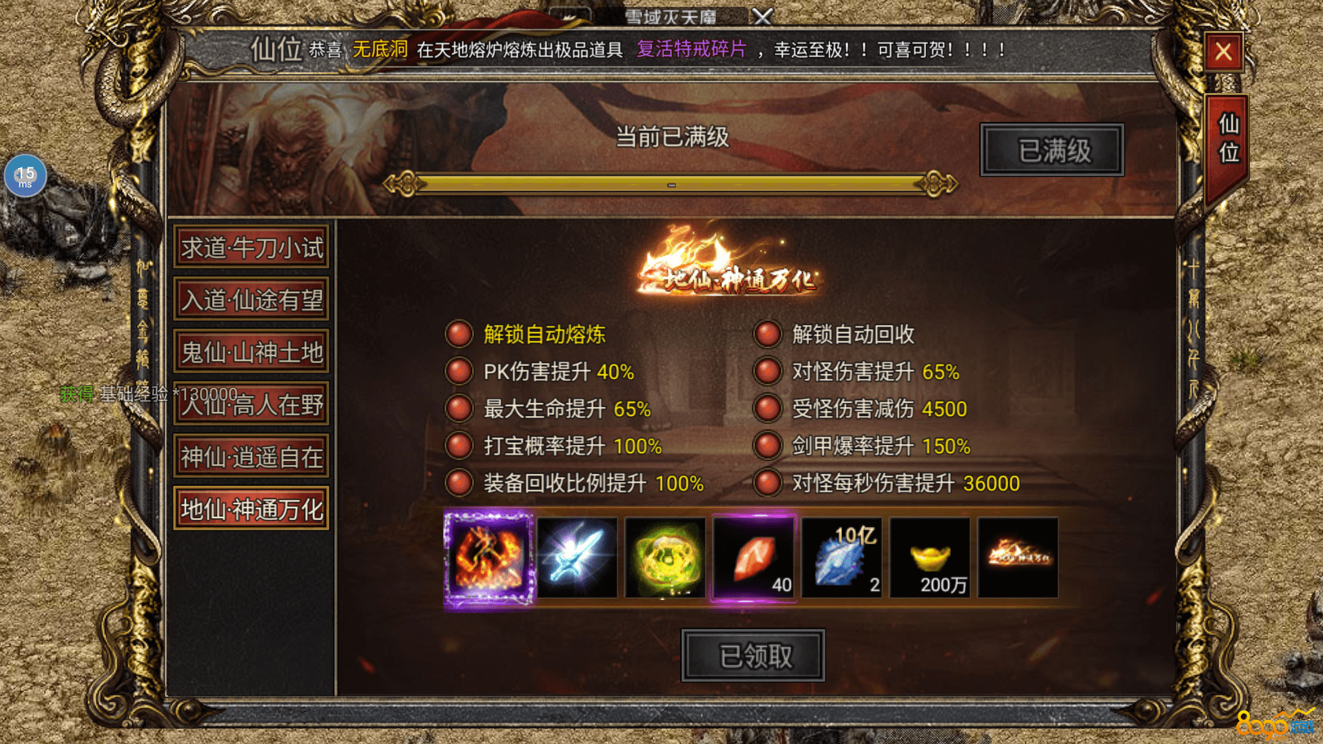 地仙 神通万化:需要300000灵符来购买,特权有:打宝概率+100%,受到伤害减伤4500,能自动使用元宝经验,装备回收比例提升100%,每秒对怪造成伤害提升36000,最大生命值提升65%,PK值伤害提升40%,剑甲爆率提升150%。