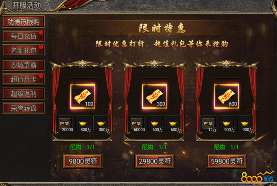 在飞升大陆上使用道具功德符来提升仙职,功德符可以在开启飞升大陆之后,在每日的极品限购中就可以购买,每天可以买1000张功德符,但是价格还是10W灵符,功德符也可以在声望商城兑换,每天只能兑换30张,升级仙位不仅需要功德符,还需要更多的元宝。