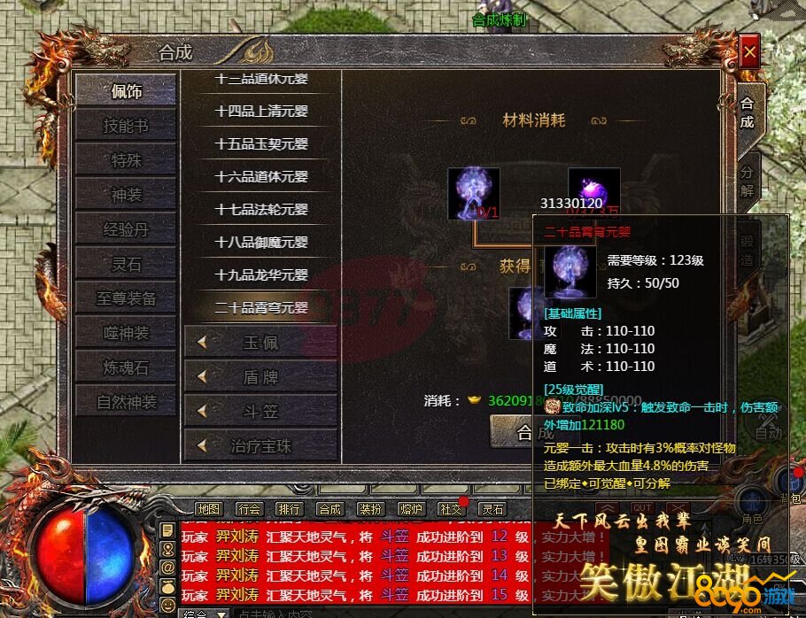 14、十四品上清元婴合成:需要消耗十三品道休元婴、5840个归元丹、2490W绑定元宝;