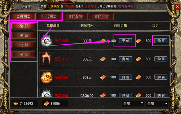 买家身份:当玩家想要用灵符快速获取装备或材料时,那么玩家就可以进入拍卖行中选取自己想要的进行购买,每个道具只能竞拍一次,谁竞拍的价格高,商品就归谁,若没有竞拍到,拍卖行会将你的灵符原数归还,一口价最高的买家可直接将商品买下,然后可以立即获得这个道具。